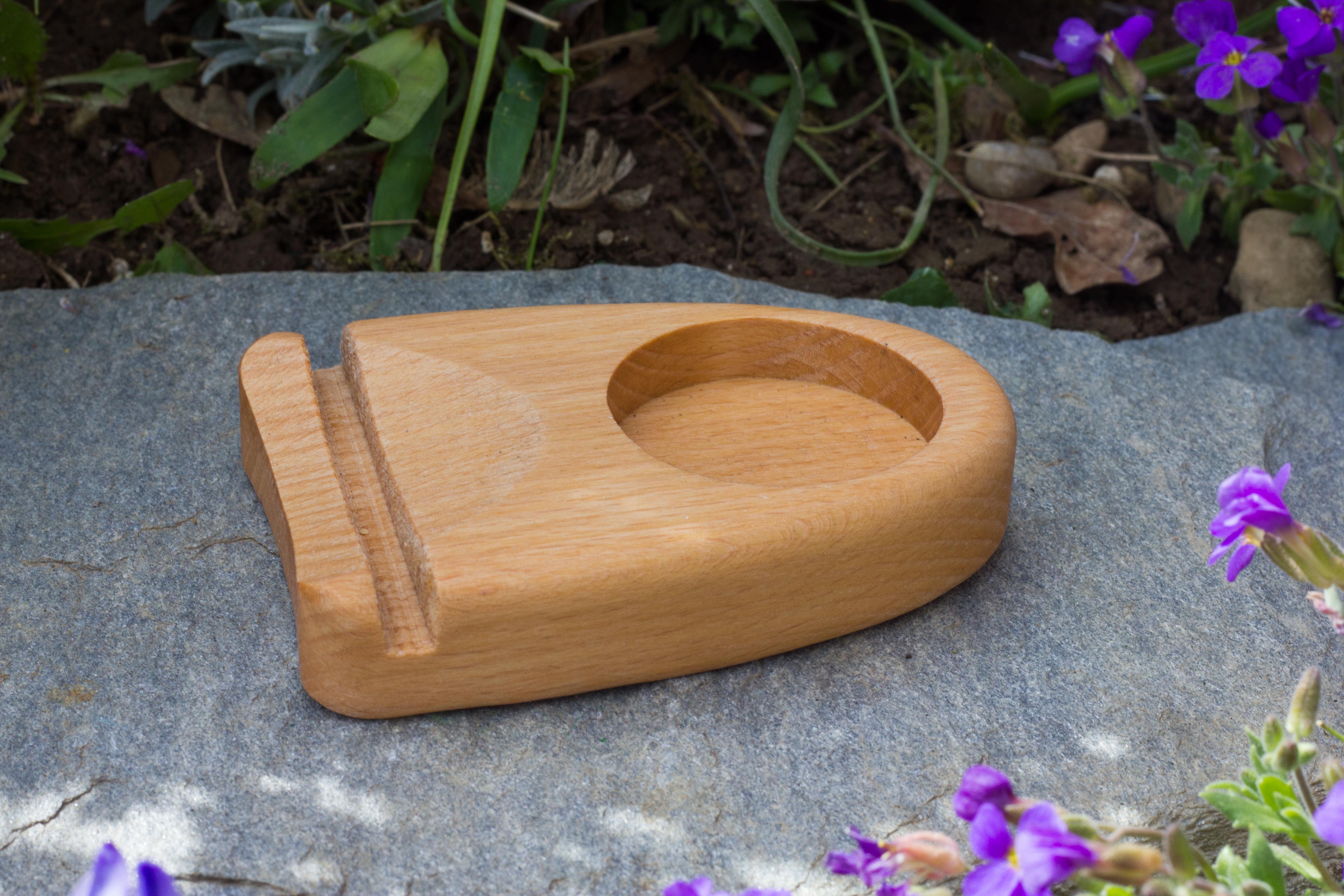 Geölter Holzständer für eine Achatscheibe und ein handelsübliches Teelicht.