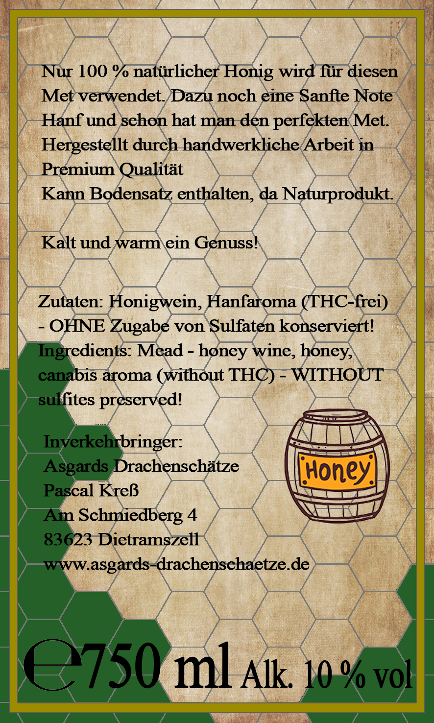 Zutaten: Gärwasser, Honig, Hanfaroma & Hanfextrakt (THC-frei), Hefe - Ohne Zugabe von Sulfiten konserviert!