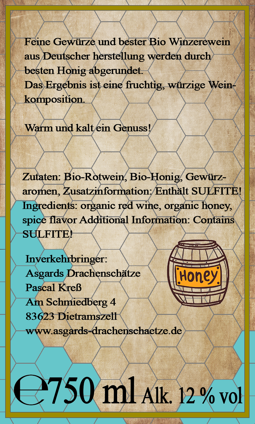 Zutaten: deutscher Bio-Rotwein, deutscher Bio-Honig, Gewürze