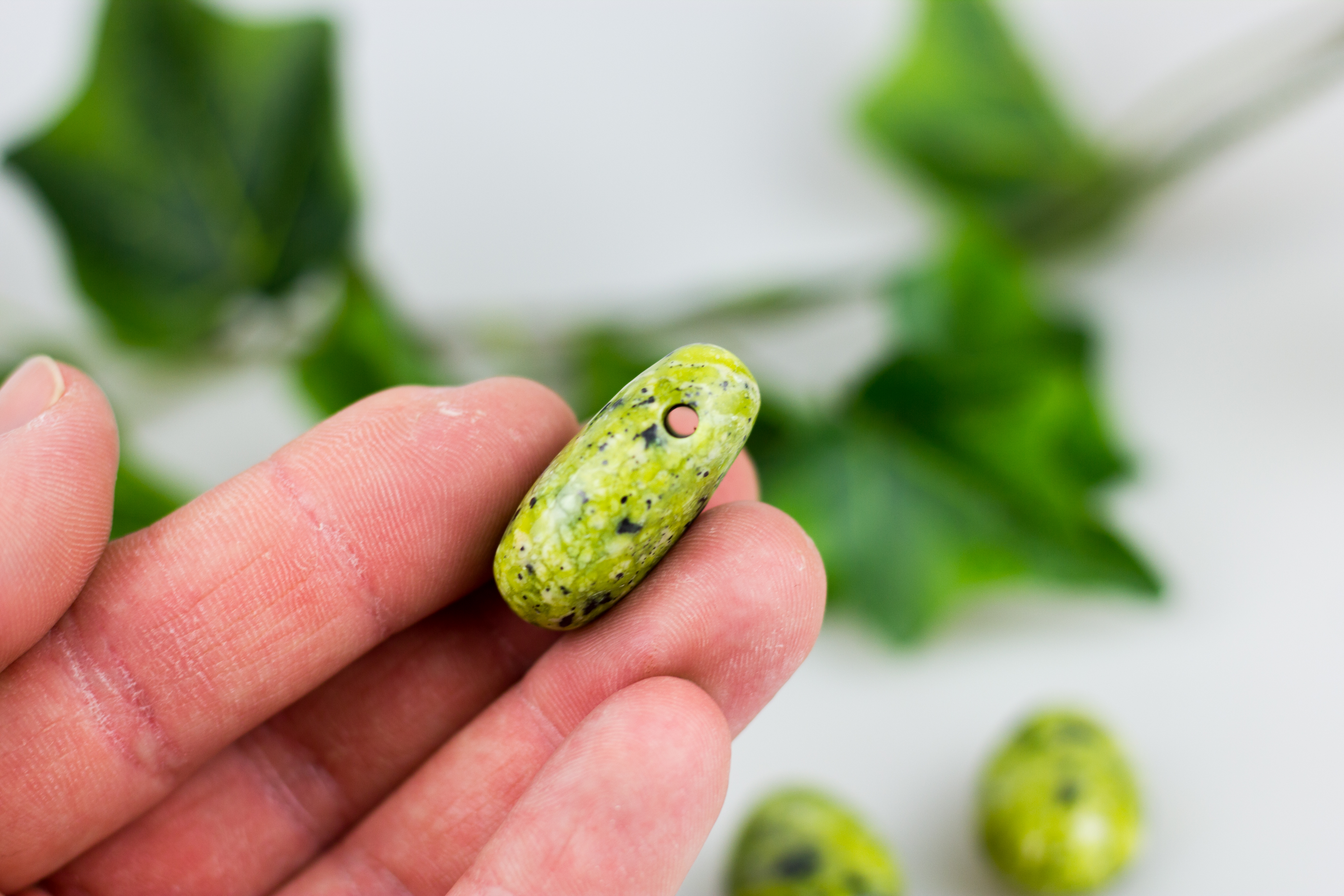 Dieser getrommelte Tropfenanhänger hat eine Lochbohrung womit man diese Anhänger einfach mit einem Band versehen kann.