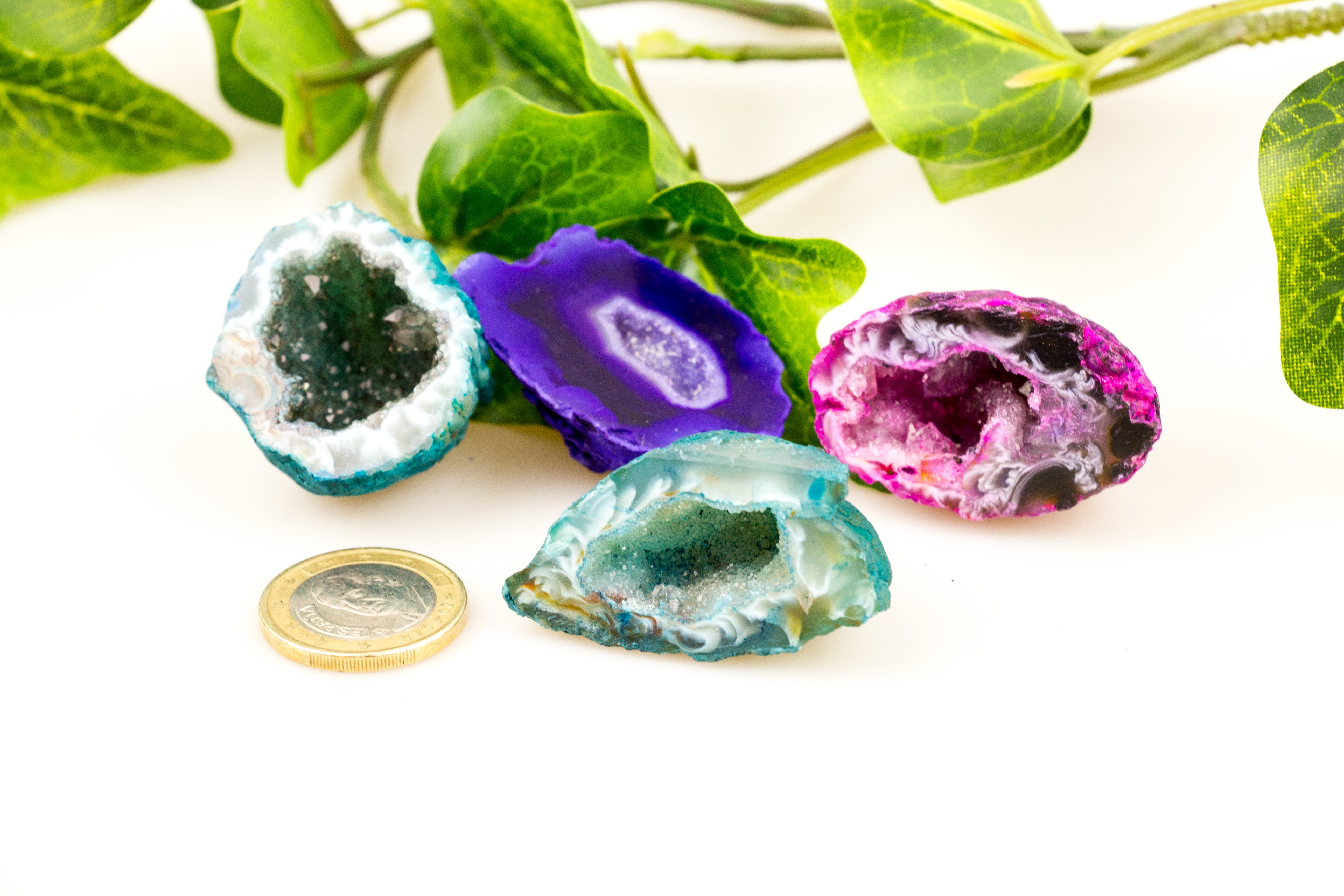 Diese kleinen Achatgeoden wurden in verschiedenen Farben eingefärbt.