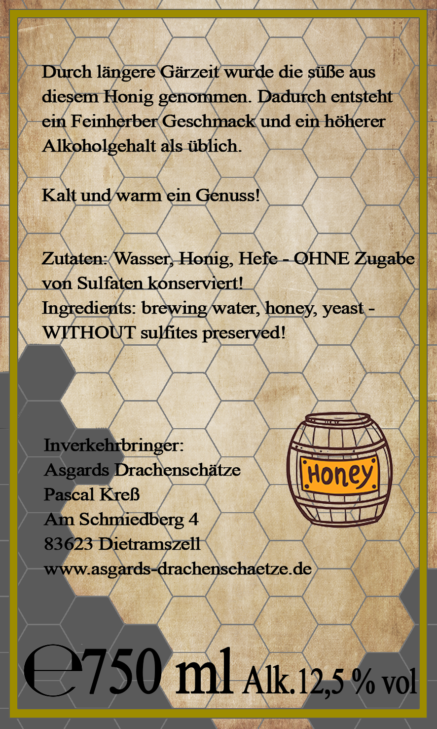 Zutaten: Wasser, Honig, Hefe - Ohne Zugabe von Sulfiten konserviert!