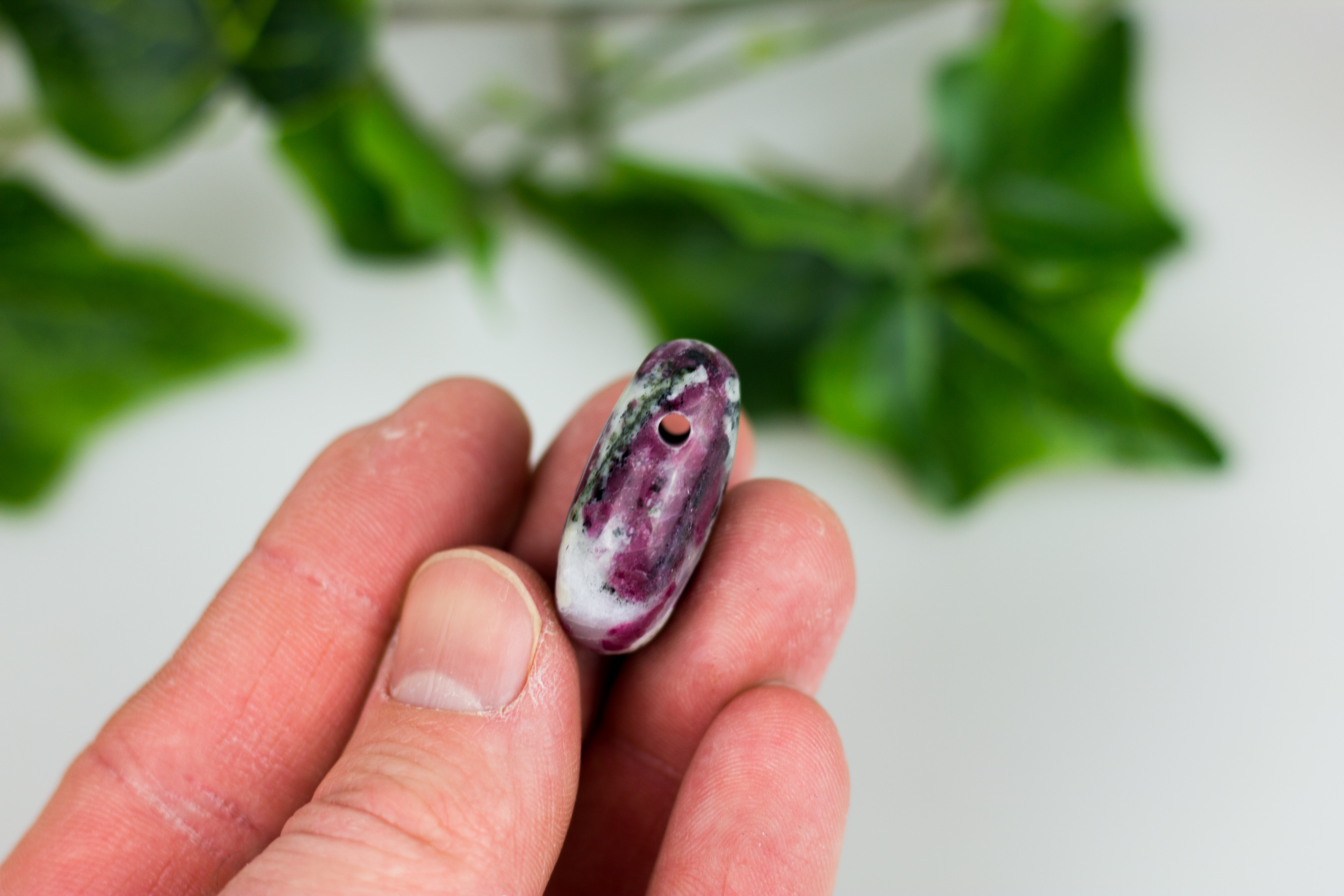 Jeder Stein ist mit einer Lochbohrung versehen. Dadurch ist ein einfaches Auffädeln auf ein Band gewährleistet.