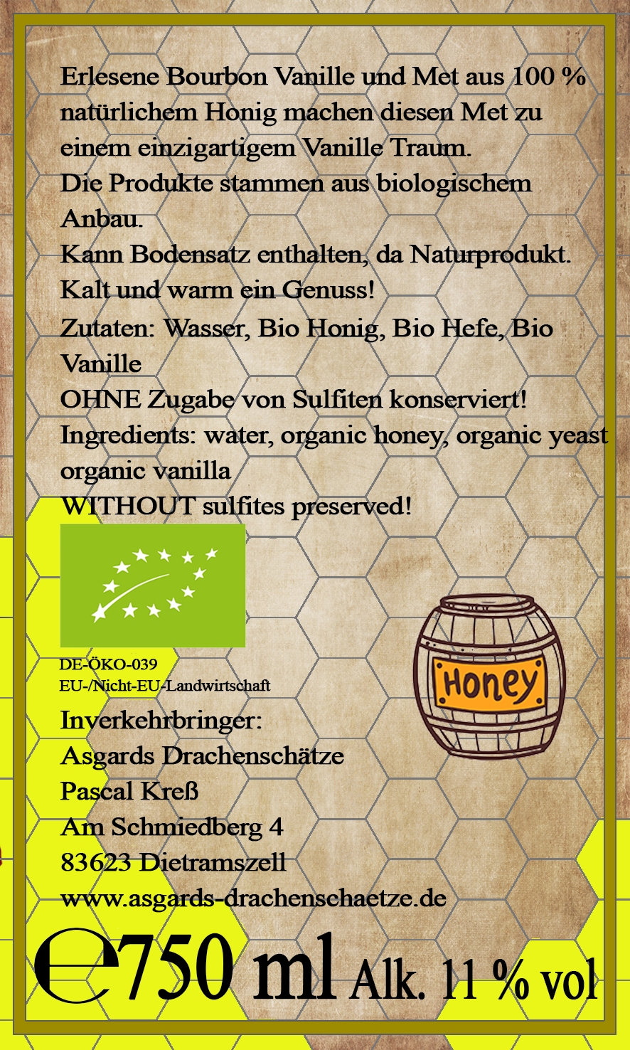 Zutaten: Wasser, Bio-Honig, Bio-Hefe, Bio-Vanilleschote - Ohne Zugabe von Sulfiten konserviert!