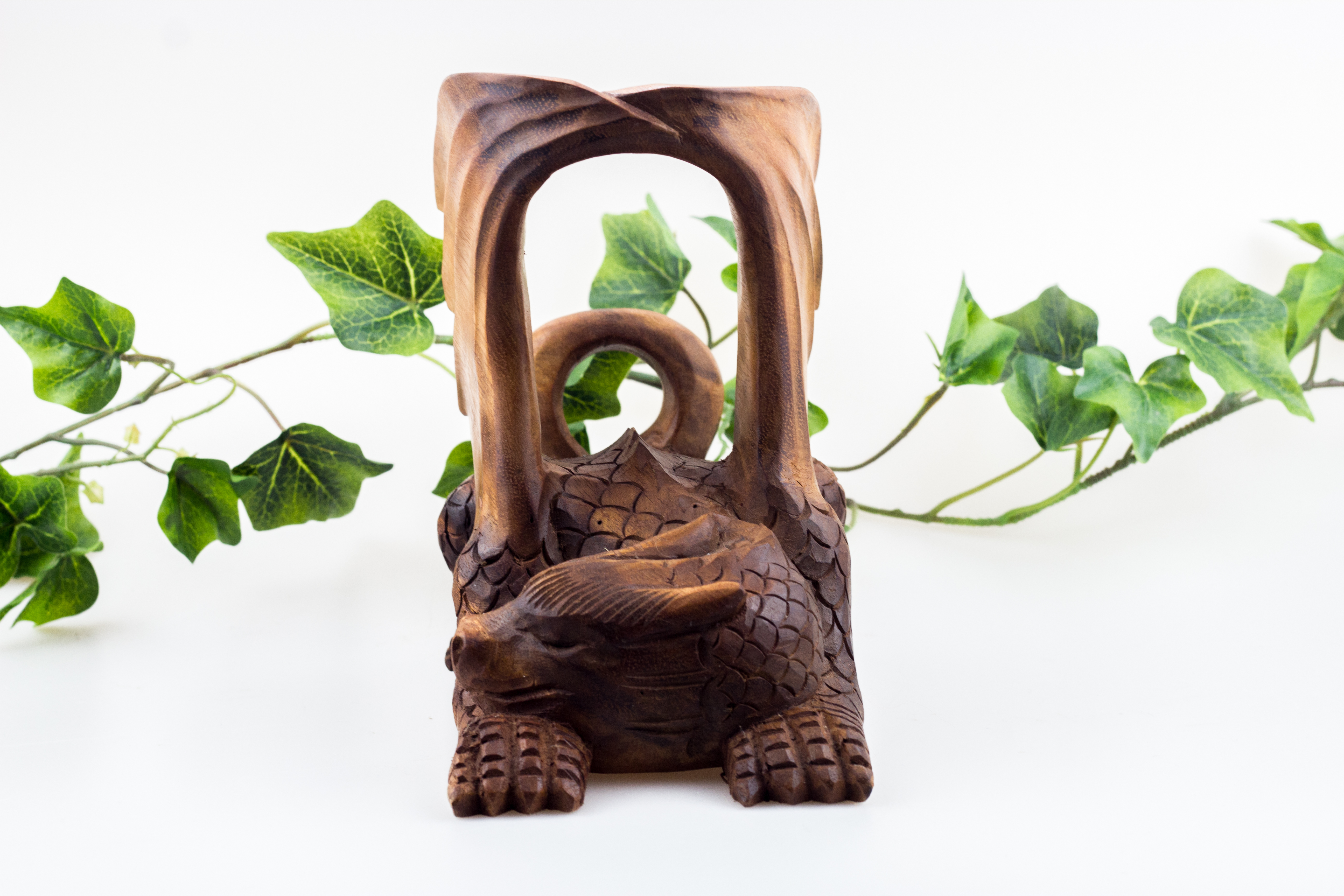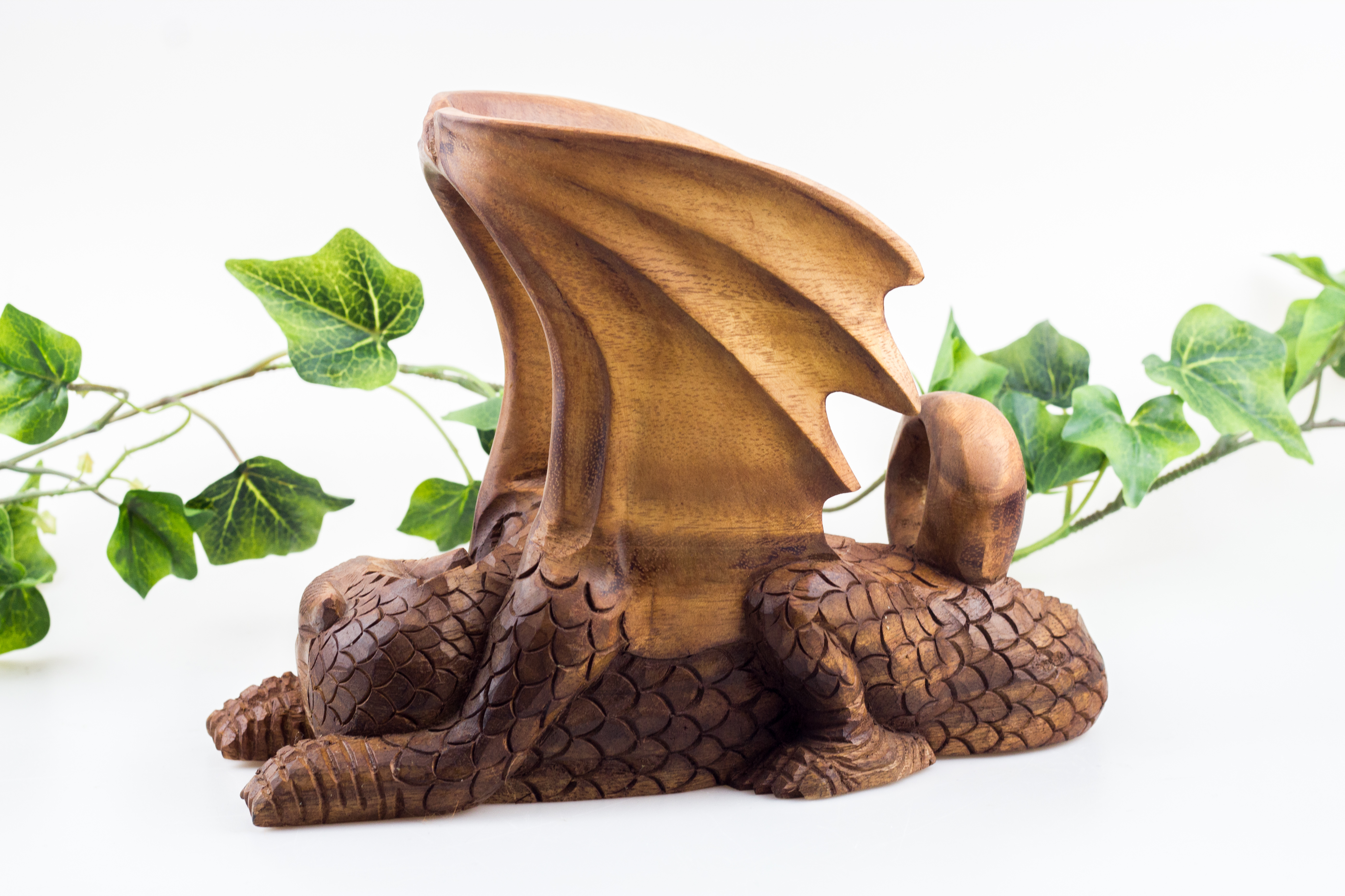 Produktinformationen "Handgearbeiteter Trinkhornständer - SLEEPY DRAGON - 23 cm - Wikinger Drachen Figur aus Holz"