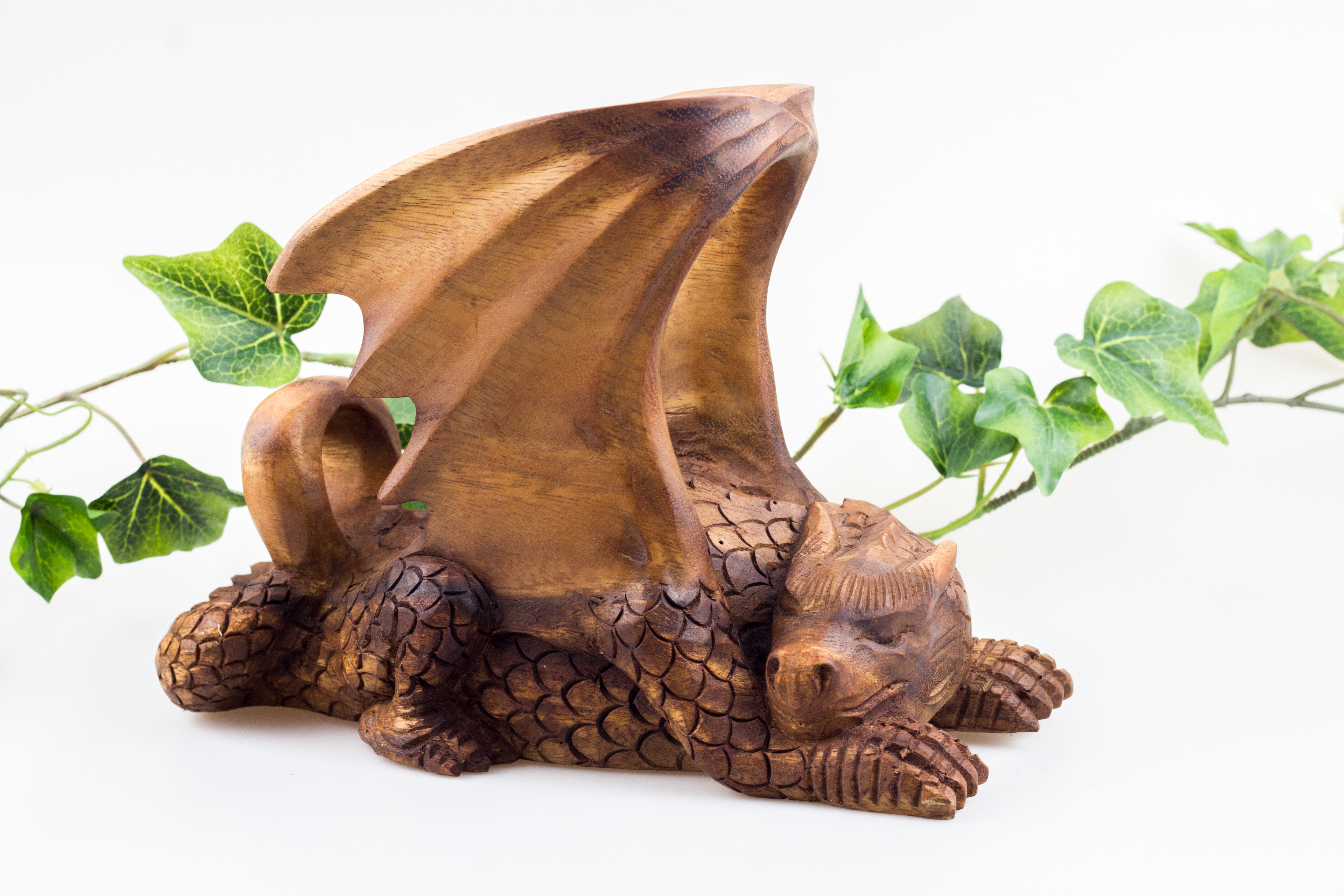 Handgearbeiteter Trinkhornständer - SLEEPY DRAGON - 23 cm - Wikinger Drachen Figur aus Holz