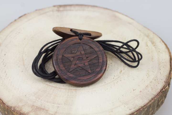 Handgefertigter Anhänger aus Sono-Holz in Form eines Schutzkreises mit Pentagramm (Drudenfuß).