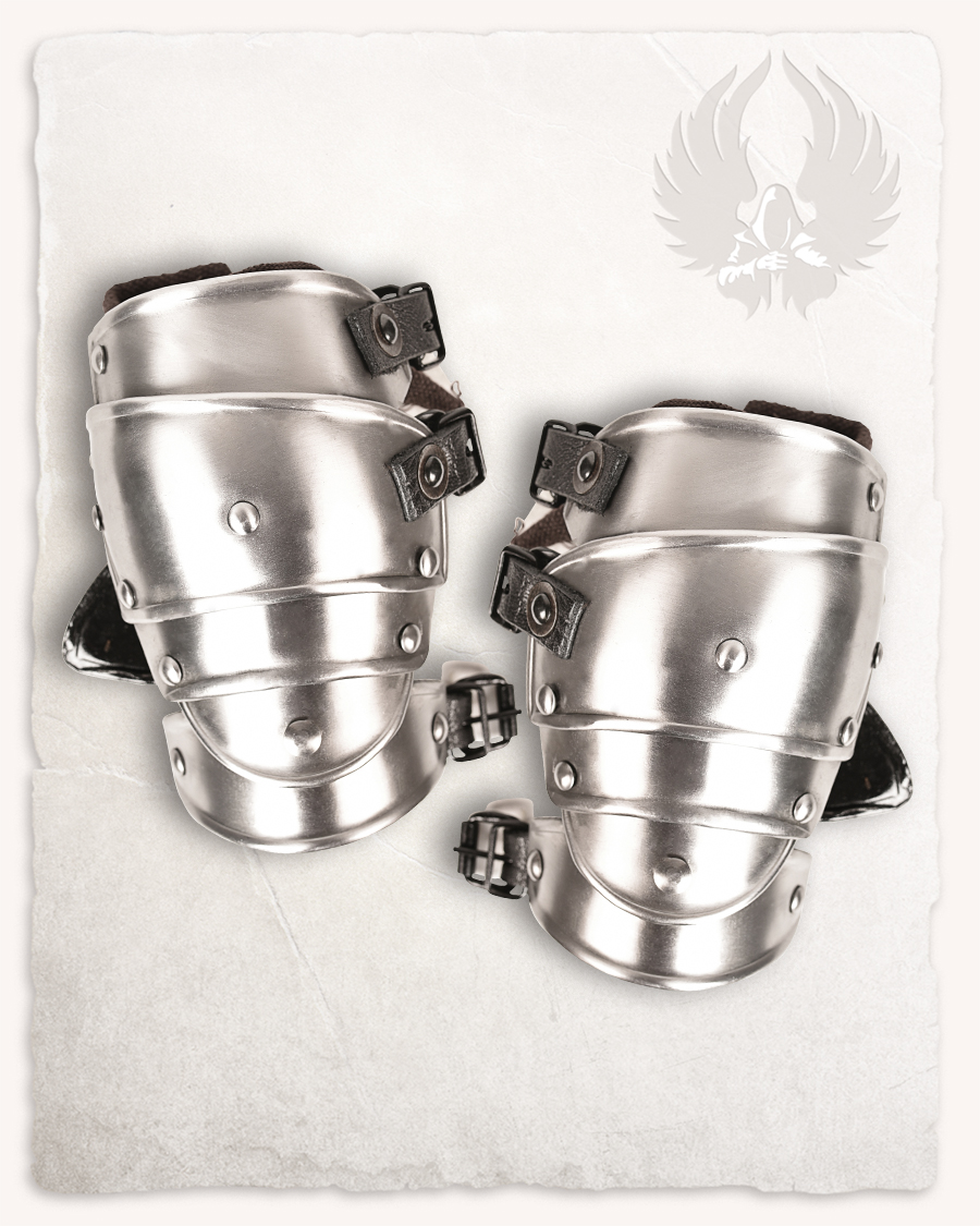 Der kurze Panzerhandschuh "Markward" ist sehr beweglich. Er ist fingerlos, besteht aus 6 flexibel verbundenen Segmenten und schränkt die Bewegung der Hand im Kampf kaum ein. Der Handschuh wird mit drei Schnallen geschlossen und kann auch über Kettenhandschuhen getragen werden. Der abgebildete Lederhandschuh ist nicht im Lieferumfang enthalten.