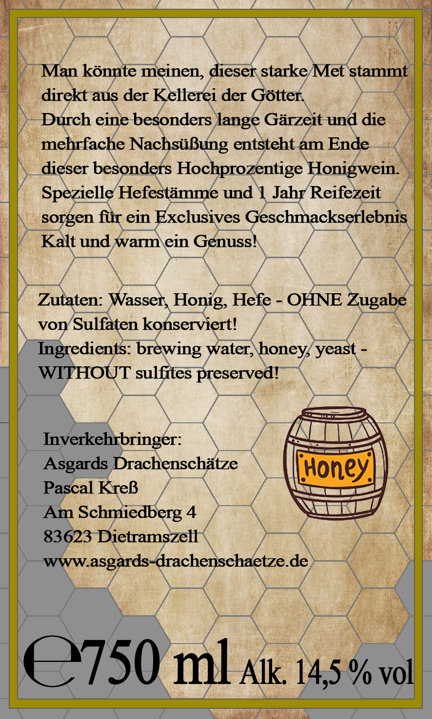 Das Ergebnis ist ein 14,5 % starker aber trotzdem süßer Honigwein über welchen selbst Thor neidisch wäre.