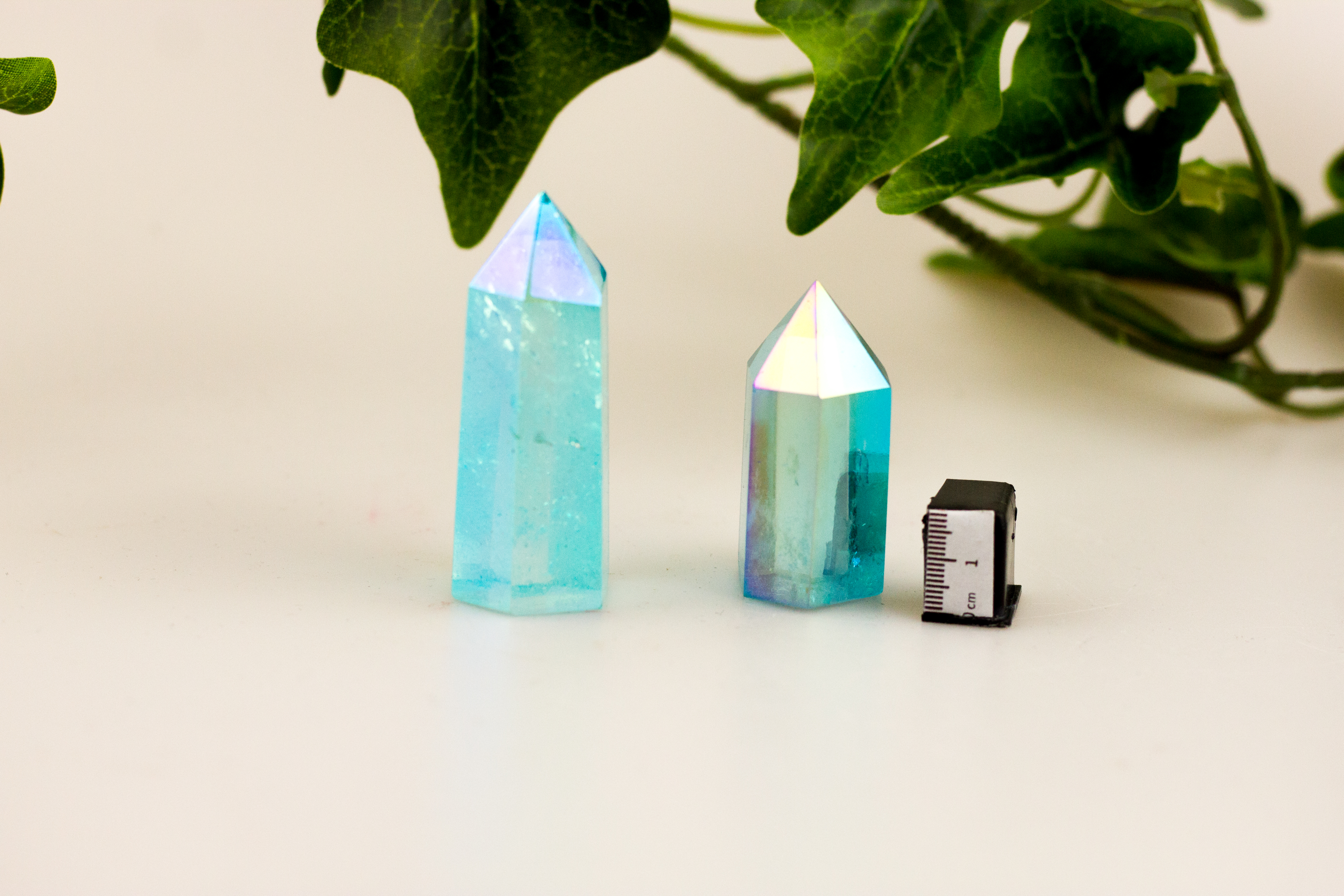 Produktinformationen "Spitze poliert Aqua Aura klein (Bergrkistall bedampft) 20 - 40 gr in Kunststoffpouch"